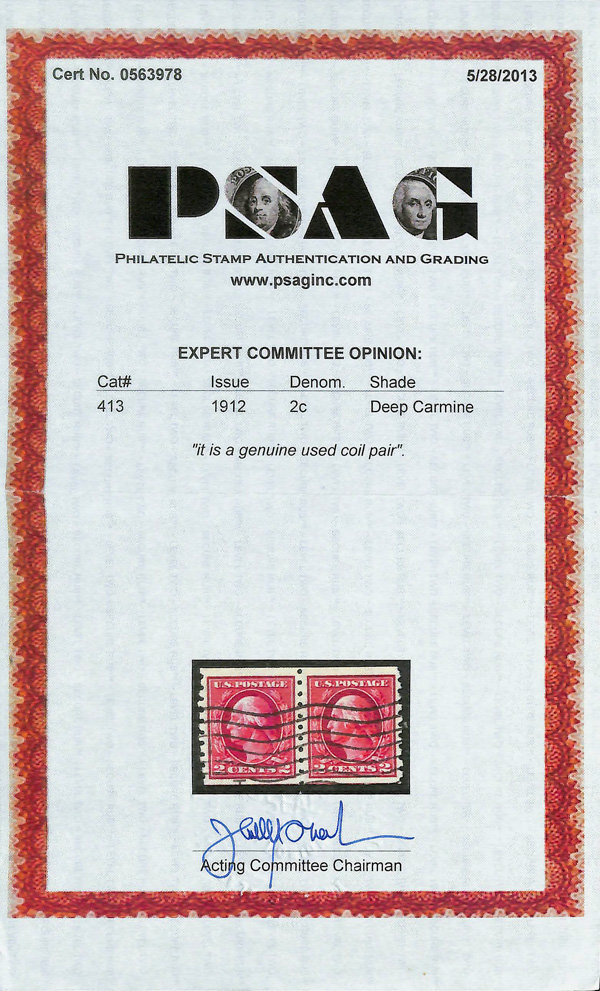 5112 O 413 image1912, 2¢ carmine, S.L. watermark, horizontal coil, perf. 12 vertically (Scott 413), pair, Fine to Very Fine, with 2013 P.S.A.G. certificate.