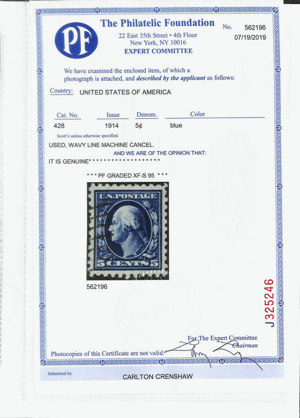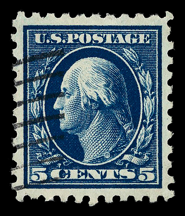 5116 O 428 image1914, 5¢ blue, S.L. watermark, perf. 10 (Scott 428); UR corner perf crease, Extremely Fine to Superb, with 2019 P.F. certificate graded XF-SUP 95.