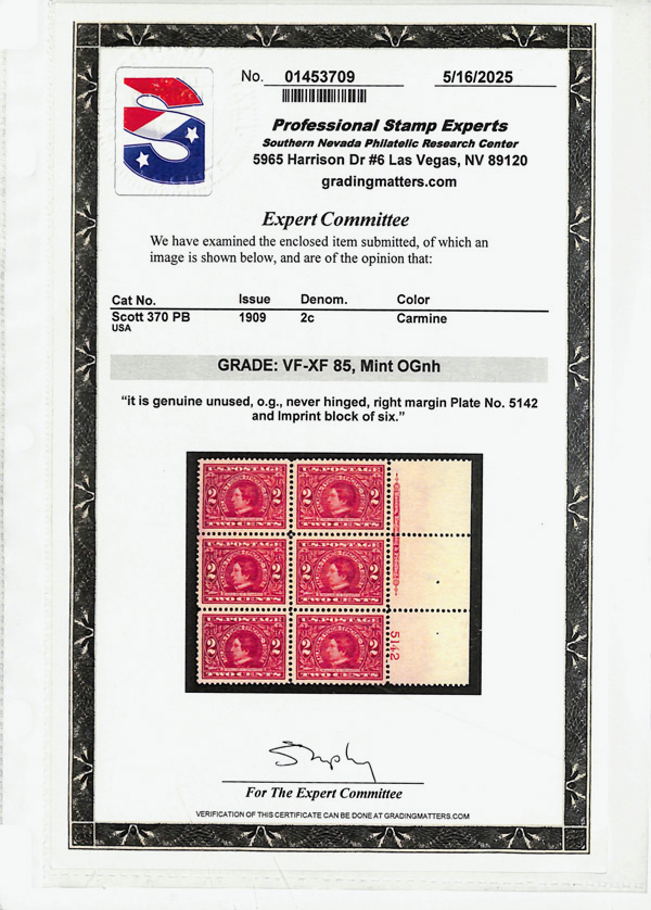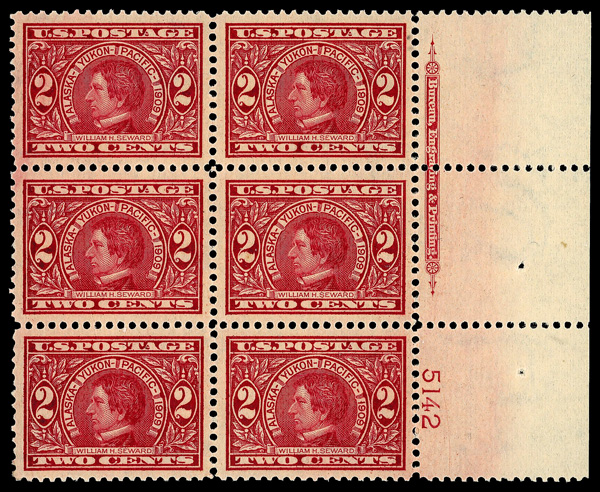 5098 nhbl 370 image1909, 2¢ Alaska-Yukon (Scott 370), plate block of 6, o.g., never hinged, Very Fine to Extremely Fine, with 2025 P.S.E. certificate graded VF-XF 85.