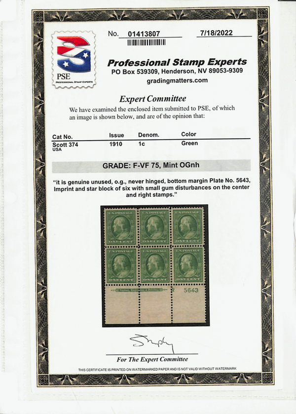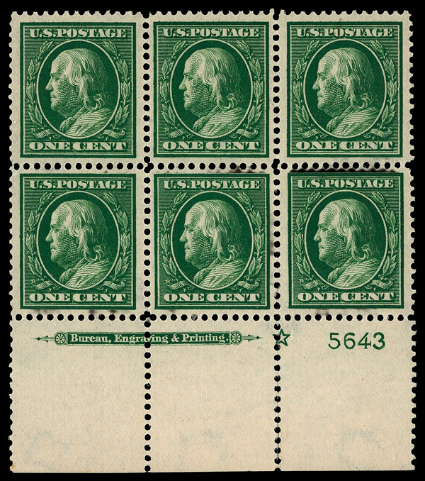 5103 nhbl 374 image1910, 1¢ green, S.L. watermark (Scott 374), plate block of 6 with star, o.g., never hinged (minor gum skips), Fine to Very Fine, with 2022 P.S.E. certificate graded F-VF 75.