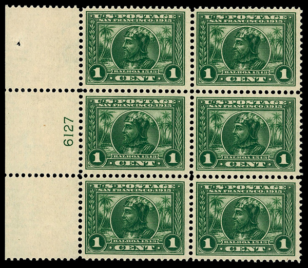 5106 nhbl 397 image1913, 1¢ Panama-Pacific, perf. 12 (Scott 397), plate block of 6, o.g., never hinged, Fine to Very Fine.