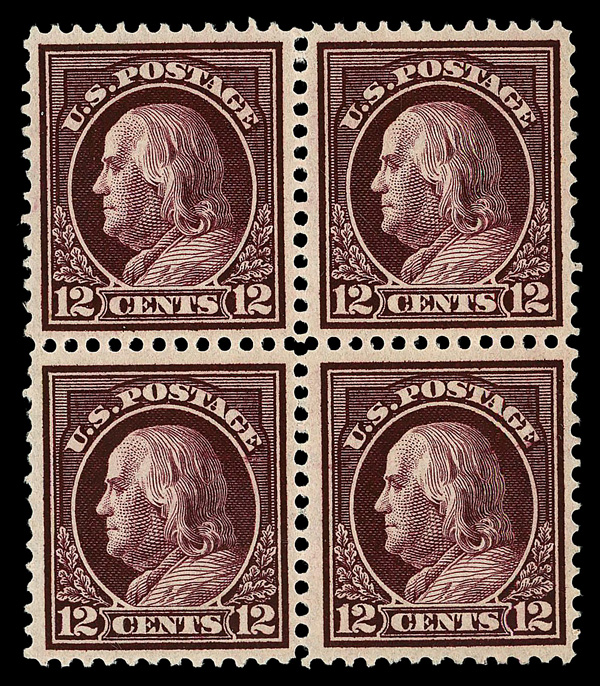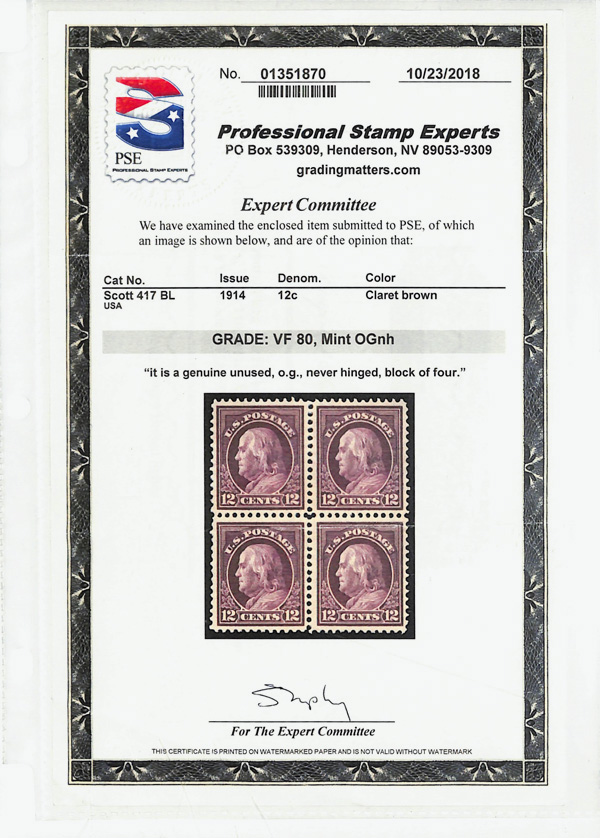 5113 nhbl 417 image1914, 12¢ claret brown, S.L. watermark, perf. 12 (Scott 417), block of 4, o.g., never hinged, Very Fine, with 2018 P.S.E. certificate graded VF 80.