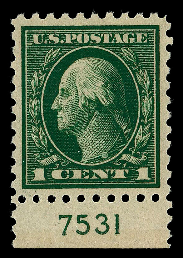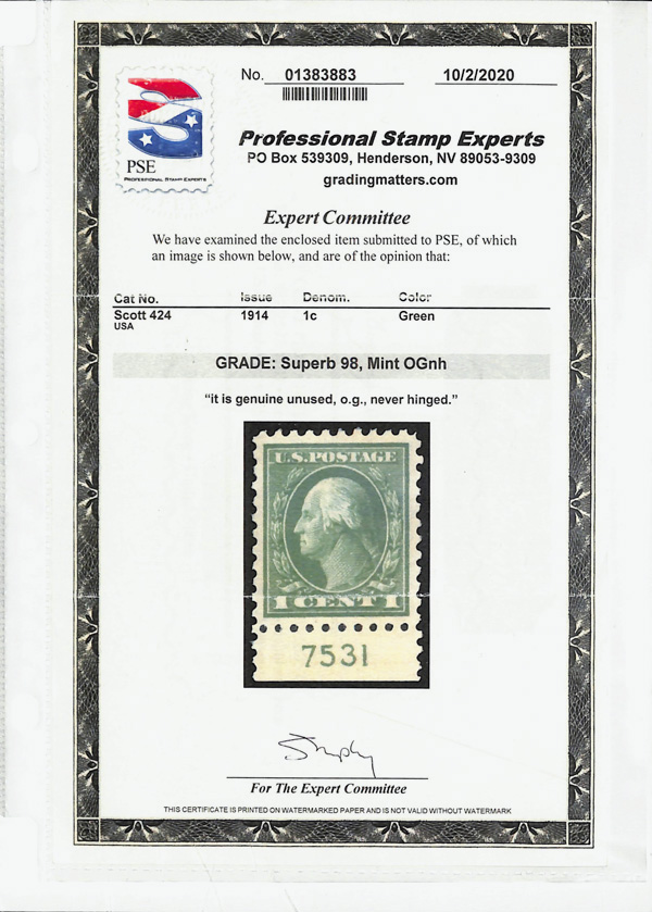 5114 nh 424 image1914, 1¢ green, S.L. watermark, perf. 10 (Scott 424), plate number single, o.g., never hinged, Superb, with 2020 P.S.E. certificate graded SUP 98.