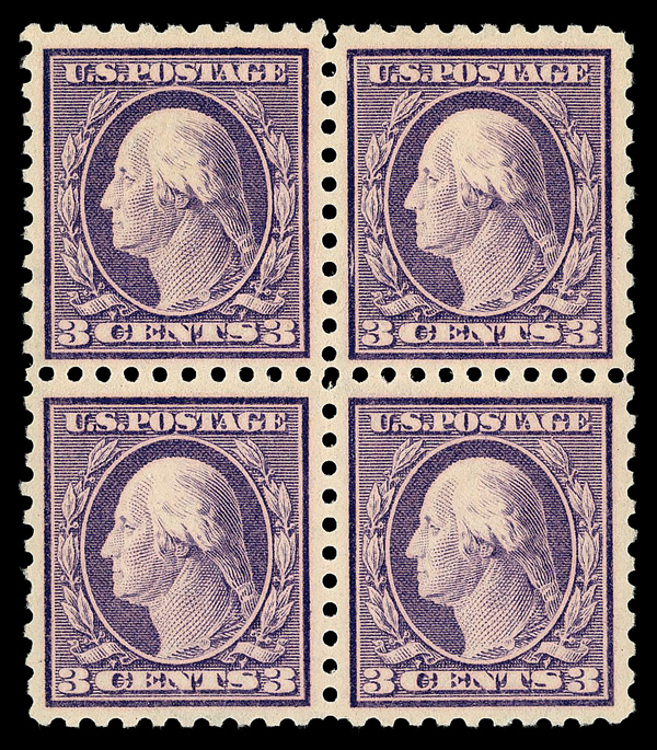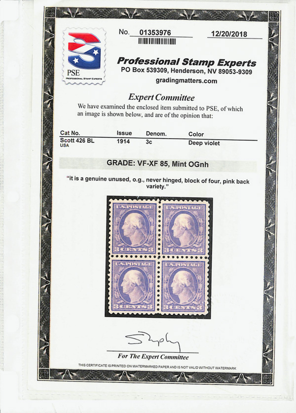 5115 nhbl 426 image1914, 3¢ deep violet, type I, S.L. watermark, perf. 10 (Scott 426), block of 4, 'pink back' variety, o.g., never hinged, Very Fine to Extremely Fine, with 2018 P.S.E. certificate graded VF-XF 85. (Image) (Image2) (All Images)