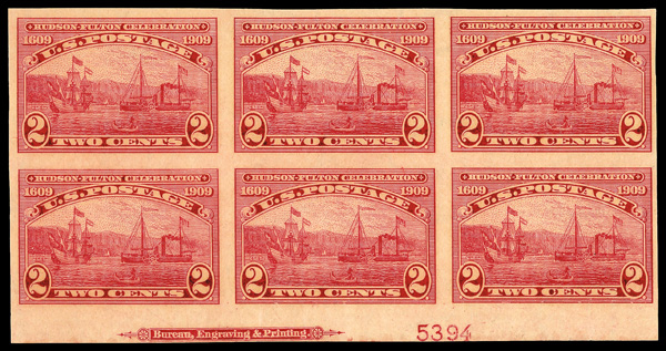 5102 ogbl 373 image1909, 2¢ Hudson-Fulton, imperf. (Scott 373), bottom margin plate block of 6 with plate number 5394, Luminous tone with clarity, o.g., previously hinged, Very Fine.
