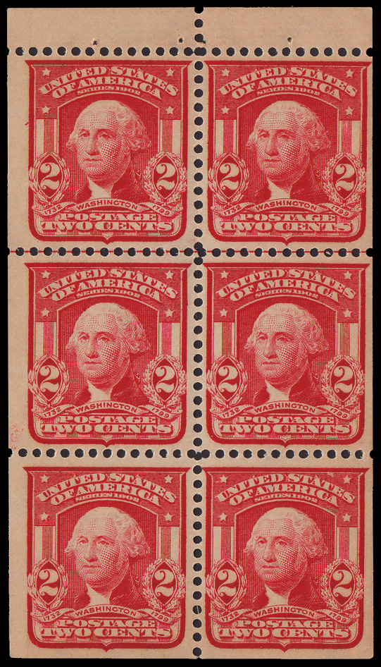 5085 BKnh 319Fq image1903, 2¢ lake, type II, booklet pane of 6 (Scott 319Fq), position E, o.g., never hinged, fresh, solid and well centered, Very Fine, includes an interleaf from the original booklet.
