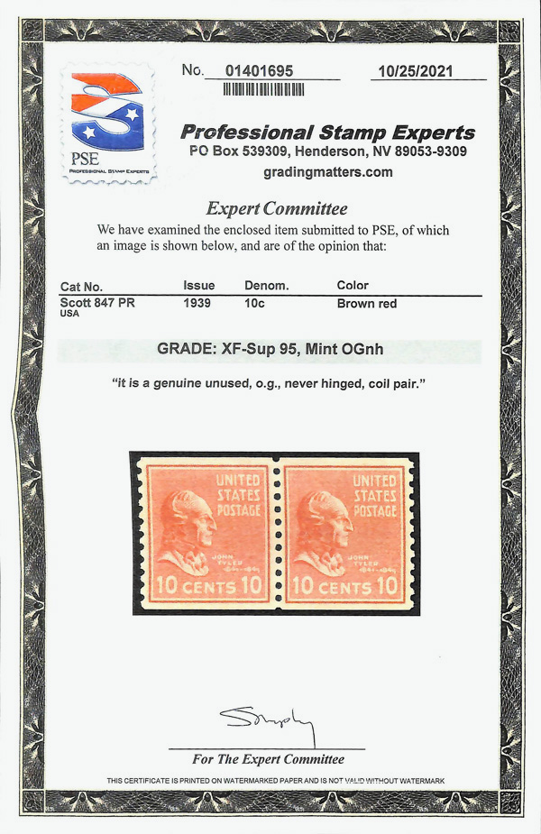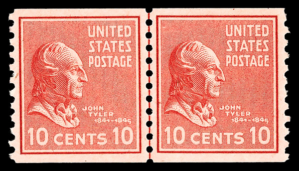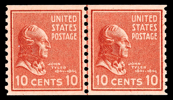 1939, Presidential Issue, 10¢ Tyler, horizontal coil, perf. 10 vertically (Scott 847), pair, o.g., never hinged,