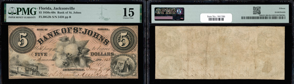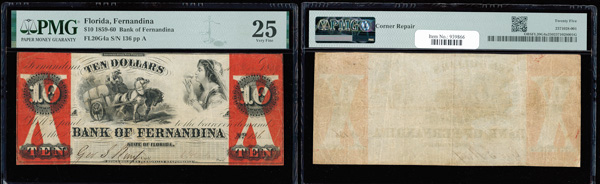 Fernandina, Florida - Bank Of Fernandina, 1859 $10 G4a PMG Very Fine 25, has a corner repair, PMG graded Very Fine