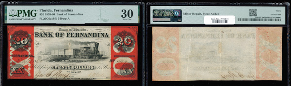 Fernandina, Florida - Bank of Fernandina $20 1860 G6a PMG Very Fine 30, minor repair, piece added, PMG graded Very Fine