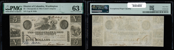 Washington, DC - Chesapeake & Ohio Canal Company Post Note $5 Oct. 9, 1840 PMG Choice Uncirculated 63 EPQ, exceptional paper