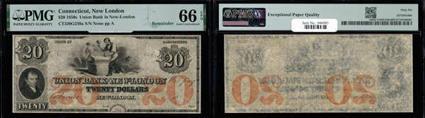New London, Connecticut - Union Bank in New-London $20 18__ G230a Remainder PMG Gem Uncirculated 66 EPQ (Haxby-G230a),