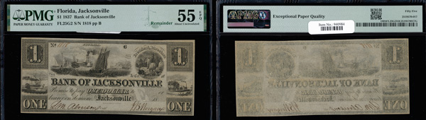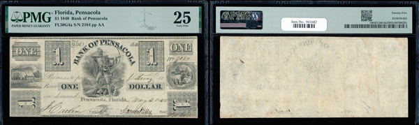 Pensacola, Florida - Bank of Pensacola $1 May 4, 1840 G4 PMG Very Fine 20 (Haxby-G4), PMG graded Very Fine 20. (Image)