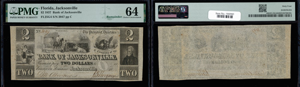 Appalachicola, Florida - Bank of West Florida $10 Nov. 3, 1832 G36 PMG Very Fine 20 (Haxby-G36), PMG graded Very Fine 20. (Image)