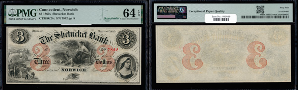 Norwich, Connecticut - Shetucket Bank $3 Jan. 1, 186_ G24c Remainder PMG Choice Uncirculated 64 EPQ. (Haxby-G24c),