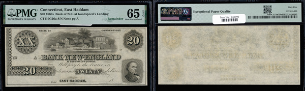 East Haddam, Connecticut - Bank of New England at Goodspeed's Landing $20 18__ G26a Remainder PMG Gem Uncirculated 65 EPQ