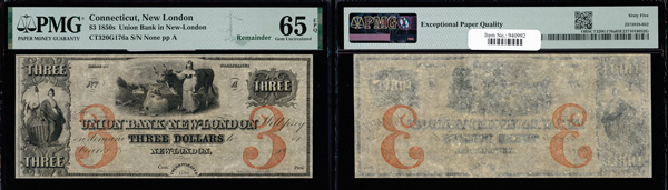 New London, Connecticut - Union Bank in New London $3 18__ G176a Remainder PMG Gem Uncirculated 65 EPQ (Haxby-G176a),