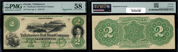 Tallahassee, Florida - Tallahassee Rail Road Company $2 18__ Remainder PMG Choice About Uncirculated 58, PMG graded Choice