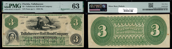 Tallahassee, Florida - Tallahassee Rail Road Company $3 18__ Remainder PMG Choice Uncirculted 63, minor rust; pinhole, PMG