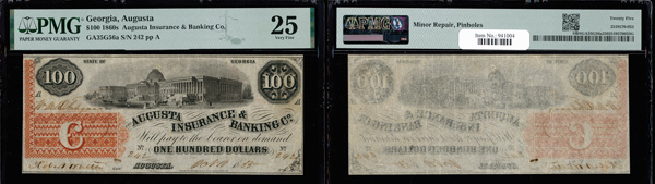 Augusta, Georgia - Augusta Insurance and Banking Co. $100 Oct. 10, 1863 G56a PMG Very Fine 25 (Haxby-G56a), minor repair;