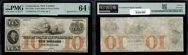 New London, Connecticut - Union Bank in New-London $10 18__ G230a Remainder PMG Choice Uncirculated 64 EPQ. (Haxby-G230a),