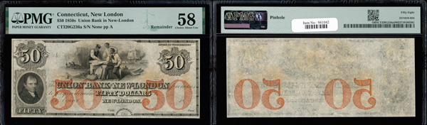 New London, Connecticut - Union Bank in New-London $50 18__ G236a Remainder PMG Choice About Unc 58 (Haxby-G236a), pinhole,