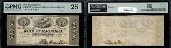 Magnolia, Florida - Merchants' and Planters' Bank at Magnolia $5 July 20, 1833 G6 Benice 3 PMG Very Fine 25 (Haxby-G6),
