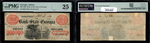 Athens, Georgia - Bank of the State of Georgia $20 Feb. 3, 1860 G156b PMG Very Fine 25 (Haxby-G156b), previously mounted,