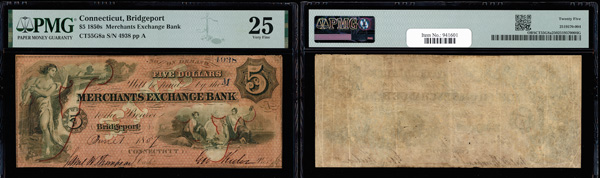 Bridgeport, Connecticut - Merchants Exchange Bank $5 June 1, 1857 CT-55 G8a PMG Very Fine 25 (Haxby-G8a), PMG graded Very