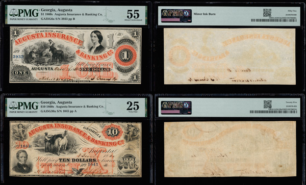Lot of (2) Augusta Obsolete: Augusta, Georgia - Augusta Insurance & Banking Co. $1 Oct. 15, 1861 G6a PMG About Unc 55 & Augusta,