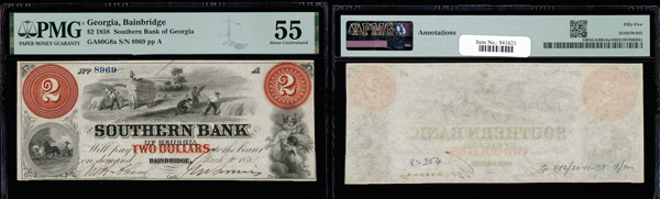 Bainbridge, Georgia - Southern Bank of Georgia $2 Mar. 1, 1858 G8a PMG About Uncirculated 55 (Haxby-G8a), annotations, PMG