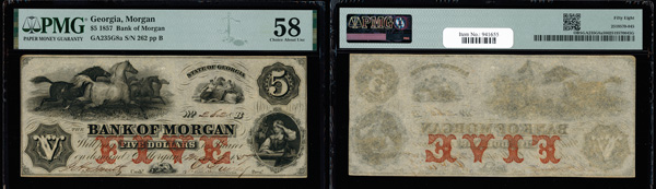 Morgan, Georgia - Bank of Morgan $5 Mar. 9, 1857 G8a PMG Choice About Unc 58 (Haxby-G8a), PMG graded Choice About