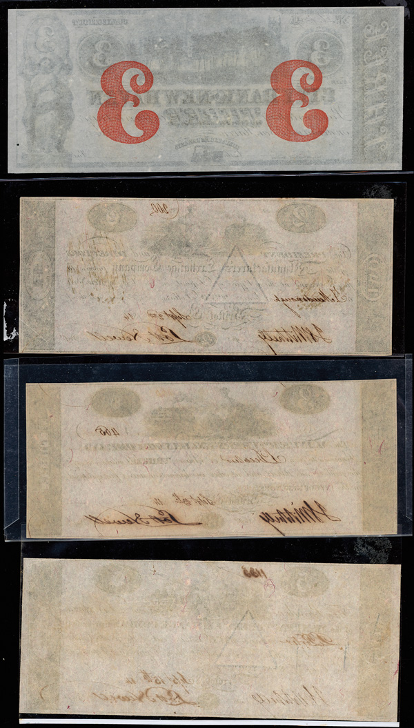 $3 1865 Remainder G36c AU; The Manufacturers' Exchange Company Bristol, CT Sep. 1814 G4 G6 G8 $2 $3 $5 Notes VF-XF (4 total). (Image) (Image2)