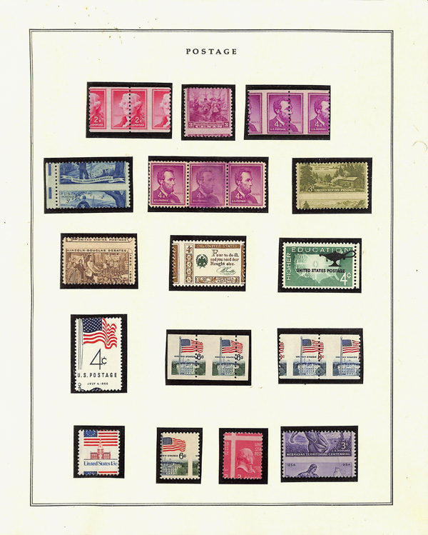50¢ NH), 294-299, 300-307 (few NH), 323-330, Washington-Franklins Perf 12's to 15¢, 397-400A NH, many coil pairs to 10¢, 498/518, 551-573, 578, 579, 581-591, 630 NH, 658-679, 692-701, C1-C6, C13-C15, C18, E5, E7, and some