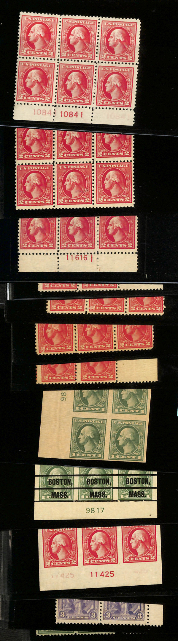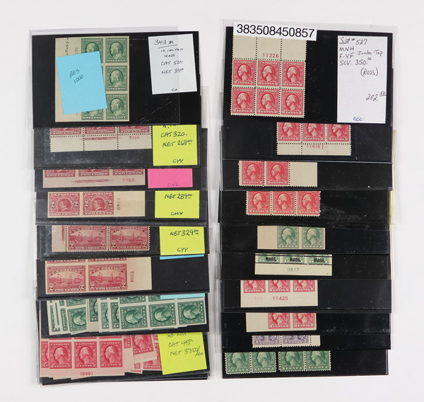 Dealer plate block stock 1908-1919, 24 counter cards with better plate blocks, annotated with catalog numbers, values, and