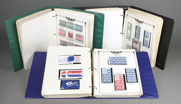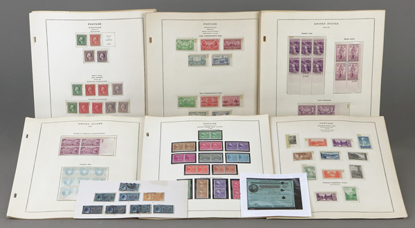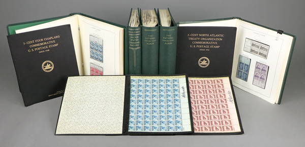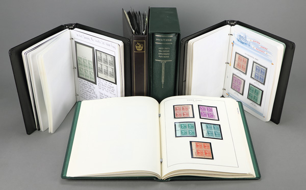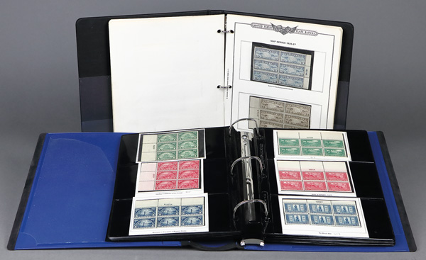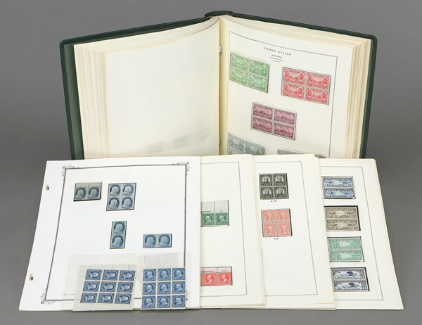 518, C1-C6, about 25 Federal Ducks, and mostly mint complete after 1935; beginning in the 1950s, the collector expertly mounted plate blocks (as well as plate strips and some sheets), First Day Covers, and Souvenir Pages; $700+