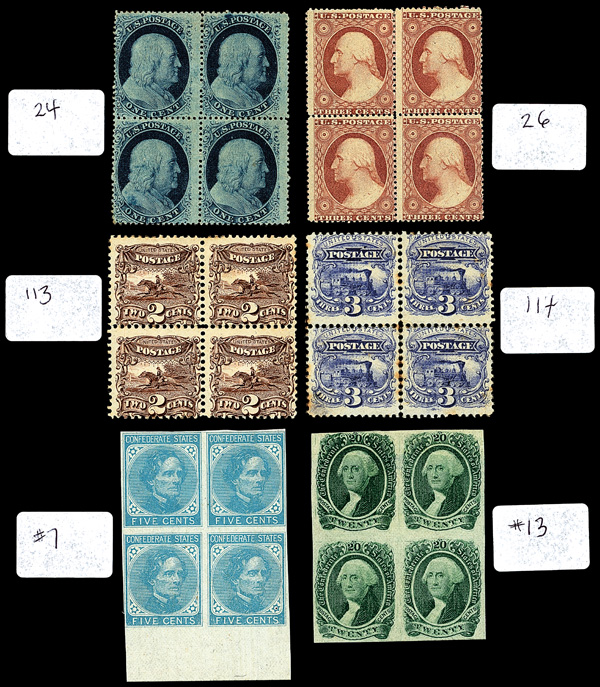 unused), 6b (pos. 96R4 with wide bottom selvage and manuscript numeral "15" cancel; 2013 PF), 8 (pos. 82L4; 2012 PSAG cert), 8A, 13, 19, 20, 21 (pos. 21R4; Weiss cert), 22, 23, 27 (2011 PSE), 28, 28A (2007 APEX & 2011 Weiss), 29, 30A, 31-33, 36, 37,