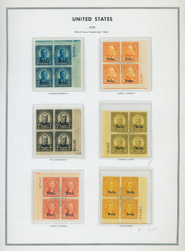 392-404 397 and 398 World's Fair pictorial cancels, 400 (2); 524-541 524, 532 and 535 mint private perforation pairs; 600-613 601 pr, 603 pr, 605 LP, 606 LP; 658-668 set of unused; 669-681 Nebraska unused and