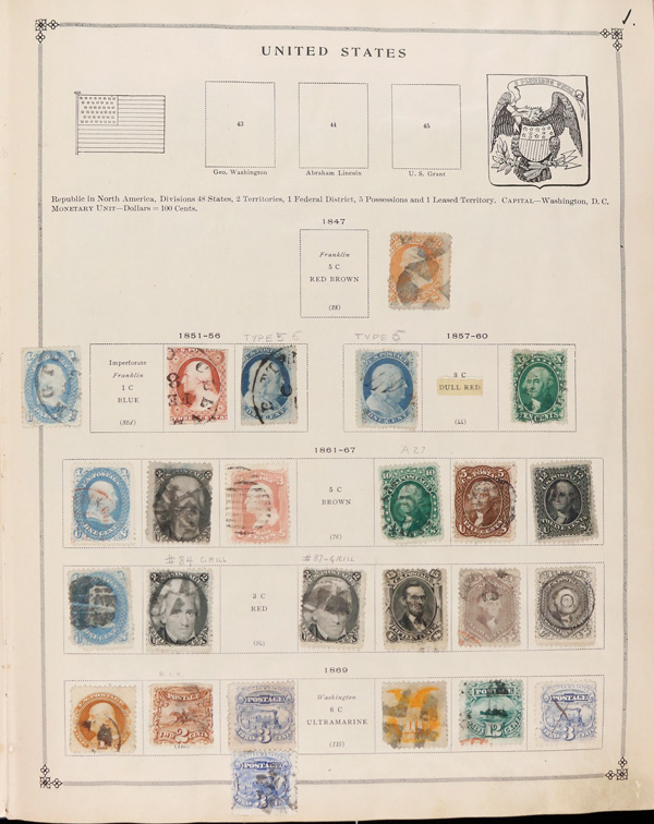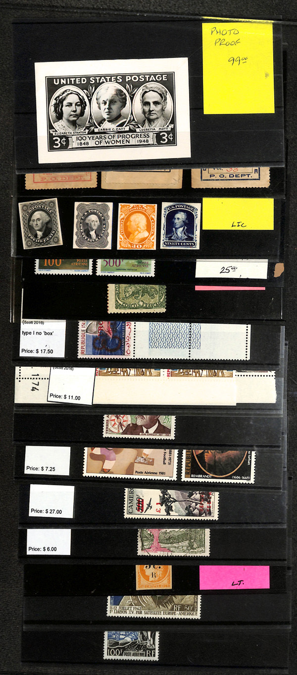 States #40P4//47P4, 113E-Dd (PF cert), three different early Dead Letter Office labels, 959 photo proof, Philippines photo essay, proofs of 10x1 and 10x2, RVB2 (on license); Worldwide France 38 (color variety), Syria 133-136, Lebanon