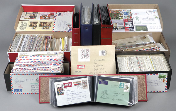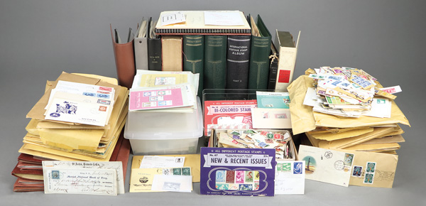 booklets; several Postal Commemorative Society offerings in issued albums; some topical including Man on the Moon; thousands of commercial envelopes (much is modern) as well as postally used postcards; numerous stockbooks country specific mostly