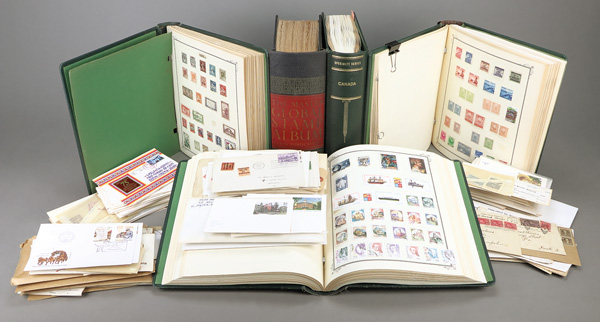 various states of disrepair, as well as seven cover collections, some themed, like Presidents of the U.S., the 1984 Olympic Games, and QEII's Silver Jubilee, a couple of stockbooks, and a box of random material. Includes a few topical collections,