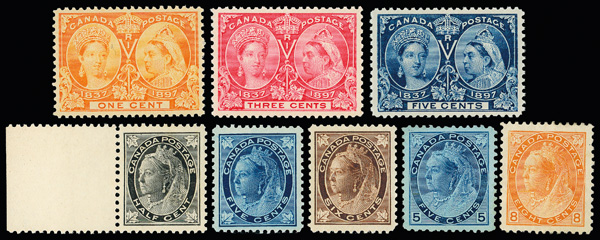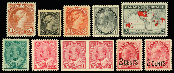 used 1-3, unused 4 (reprint), 5 (specimen), 6-11, Newfoundland used 2, 8, 11, 12, 13, 25-27, 32-34, unused 1, 3, 5, 11A, 15A, 17-23, 24, 30-31, 56-59, 61-74, 87-97, 98-103, 104-14, 115-26, 131-44, 145-59, 163-71,