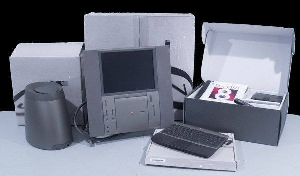 manual; black leather case for CD-ROMs; original OS system disk and a Welcome Tour disk; remote control; and keyboard with leather track pad. Shipping charges apply - weight 50 lbs. A true museum piece collectible, complete with