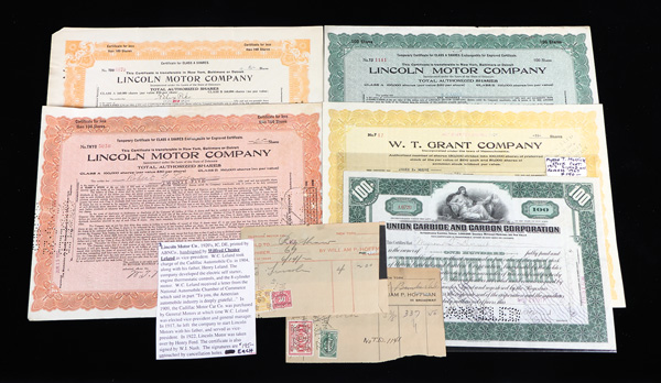 Certificate Signed On Reverse (3) 1920's Lincoln Motor Company Stock Certificates (5 items). Shipping charges apply - weight 1.4 lbs. (PDF for this
