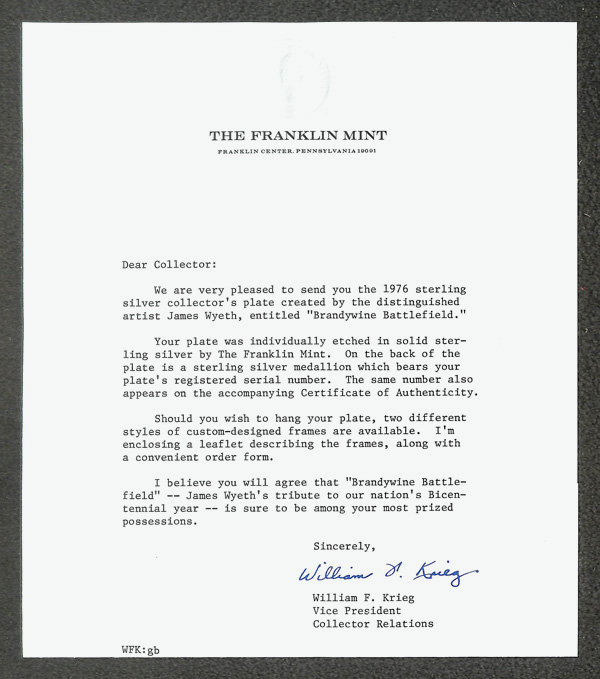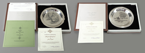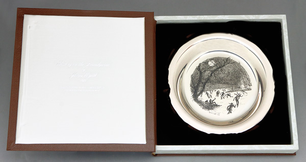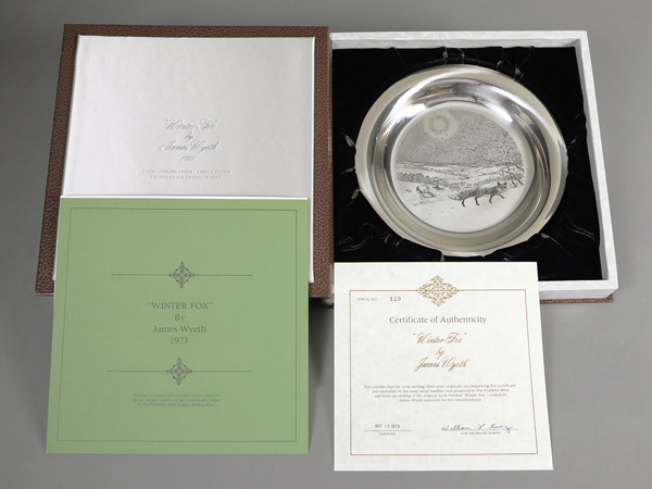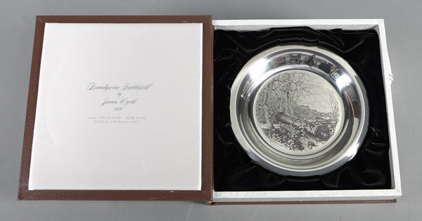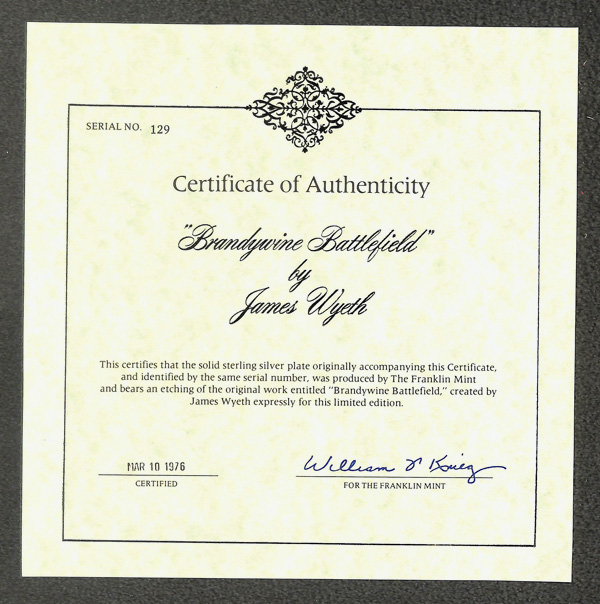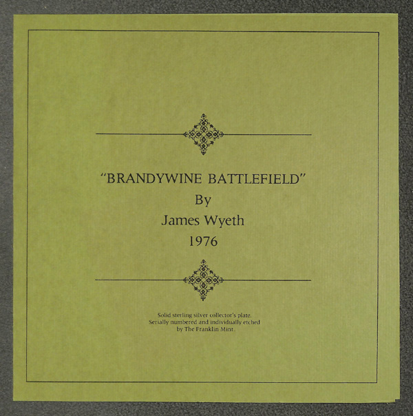 silver plate depicting James Wyeth's "Brandywine Battlefield" (1976) is in pristine condition with the original paperwork, case, and box. Shipping charges apply - weight 3.2 lbs. (Image) (Image2)