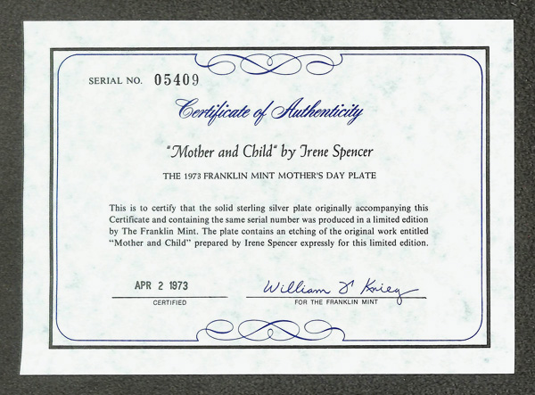 depicting Irene Spencer's "Mothers Day" (1973) is in pristine condition with the original paperwork, case, and box. Shipping charges apply - weight 3.4 lbs. (Image) (Image2)
