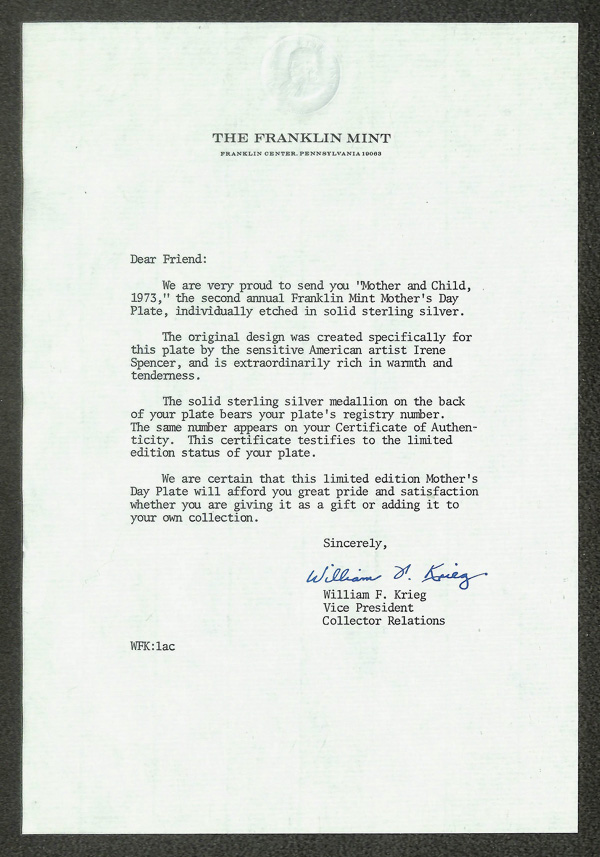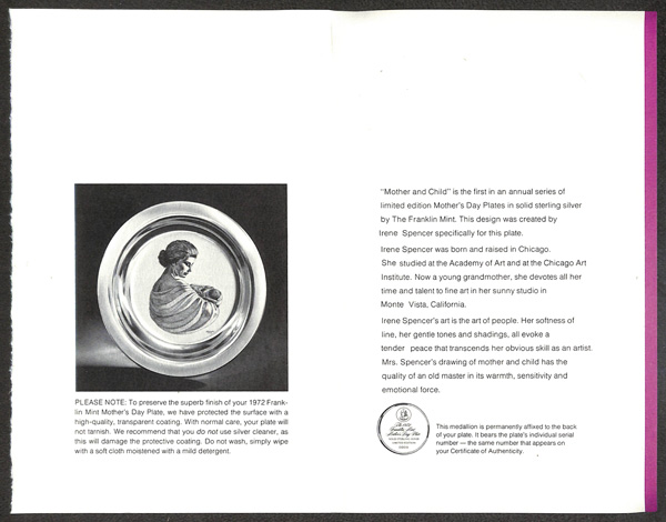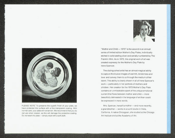 1973 Irene Spencer "Mothers Day" Silver Limited Edition Franklin Mint Collectible Plate, This limited edition silver plate