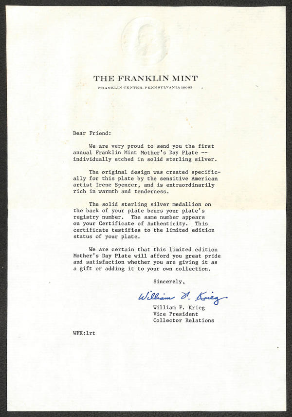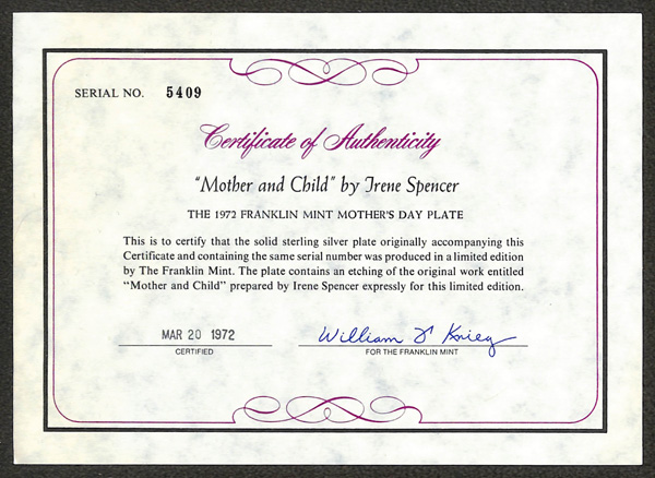 depicting Irene Spencer's "Mothers Day" (1972) is in pristine condition with the original paperwork, case, and box. Shipping charges apply - weight 2.6 lbs. (Image) (Image2)