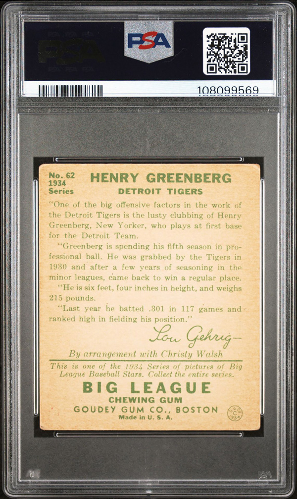 1934 Goudey #62 Hank Greenberg PSA 2.5+ Good. (Image) (Image2)