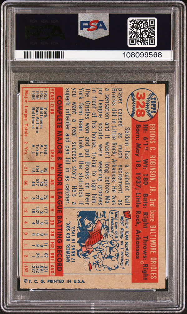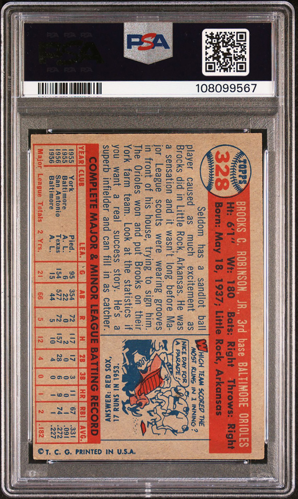 1957 Topps #328 Brooks Robinson Rookie Card PSA 4 VG-EX, Very Good to Excellent 4. (Image) (Image2)