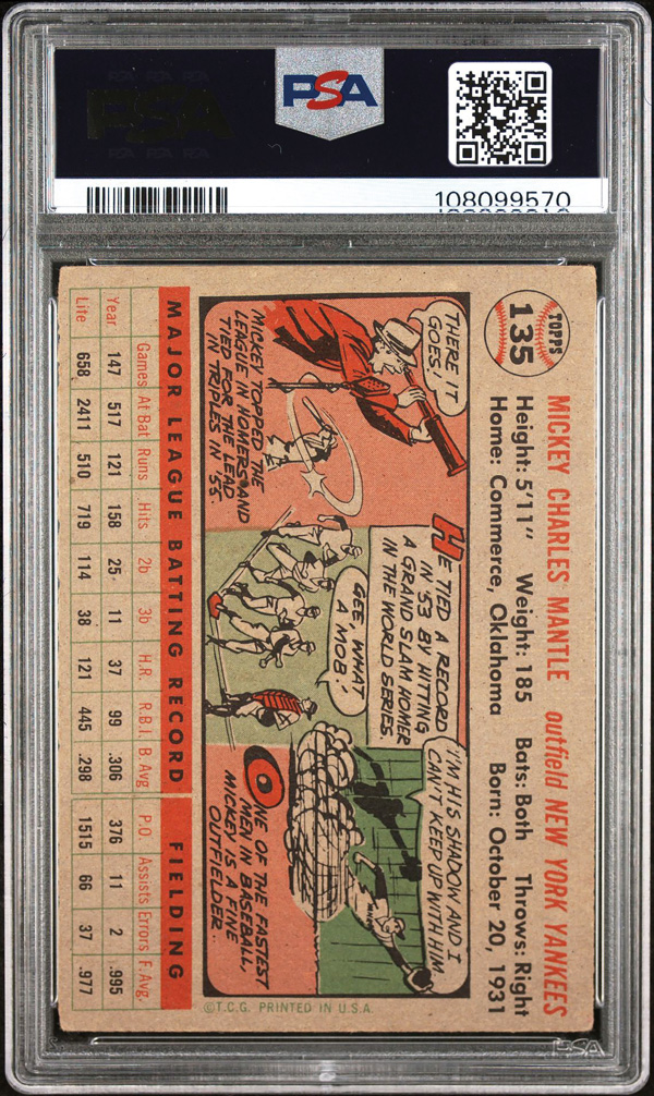 1956 Topps #135 Mickey Mantle Gray Back PSA 6 EX-MT, crisp egges; amazing color; freshly graded by PSA, Excellent to Mint